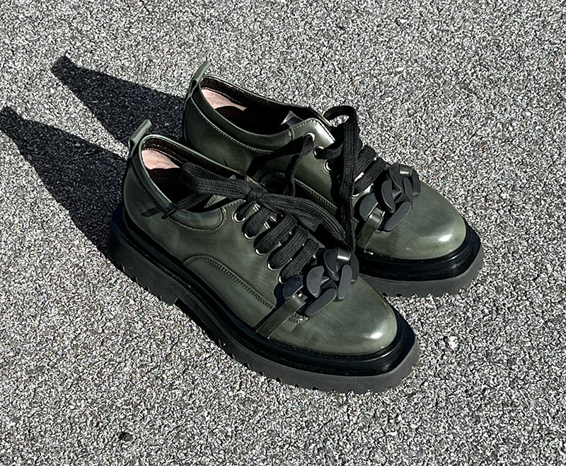 Get yourself a pair of trendy women's loafers! Loafers style is hot now. Dark green leather loafers by Laura Bellariva with a statement chunky chain element.